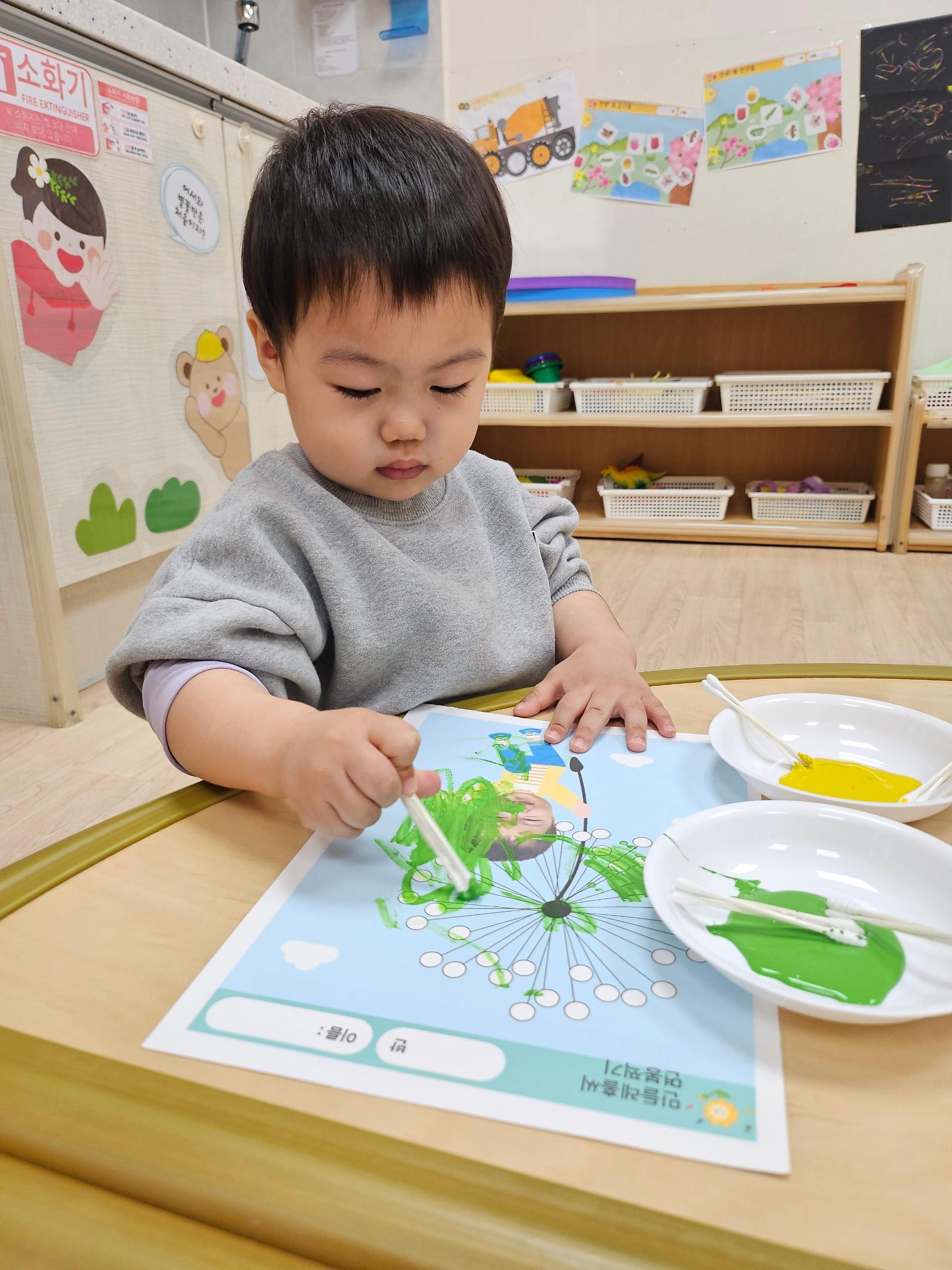 면봉을 이용해 노란색과 연두색 물감을 콕콕 찍어 나만의 민들레를 완성하는 활동이었는데요, 시원이는 조심스레 면봉을 집어 들고 집중해서 물감을 찍어냈습니다. 처음에는 약간 망설이는 듯했지만, 곧 “찍찍~”하며 능숙하게 면봉을 움직였어요.