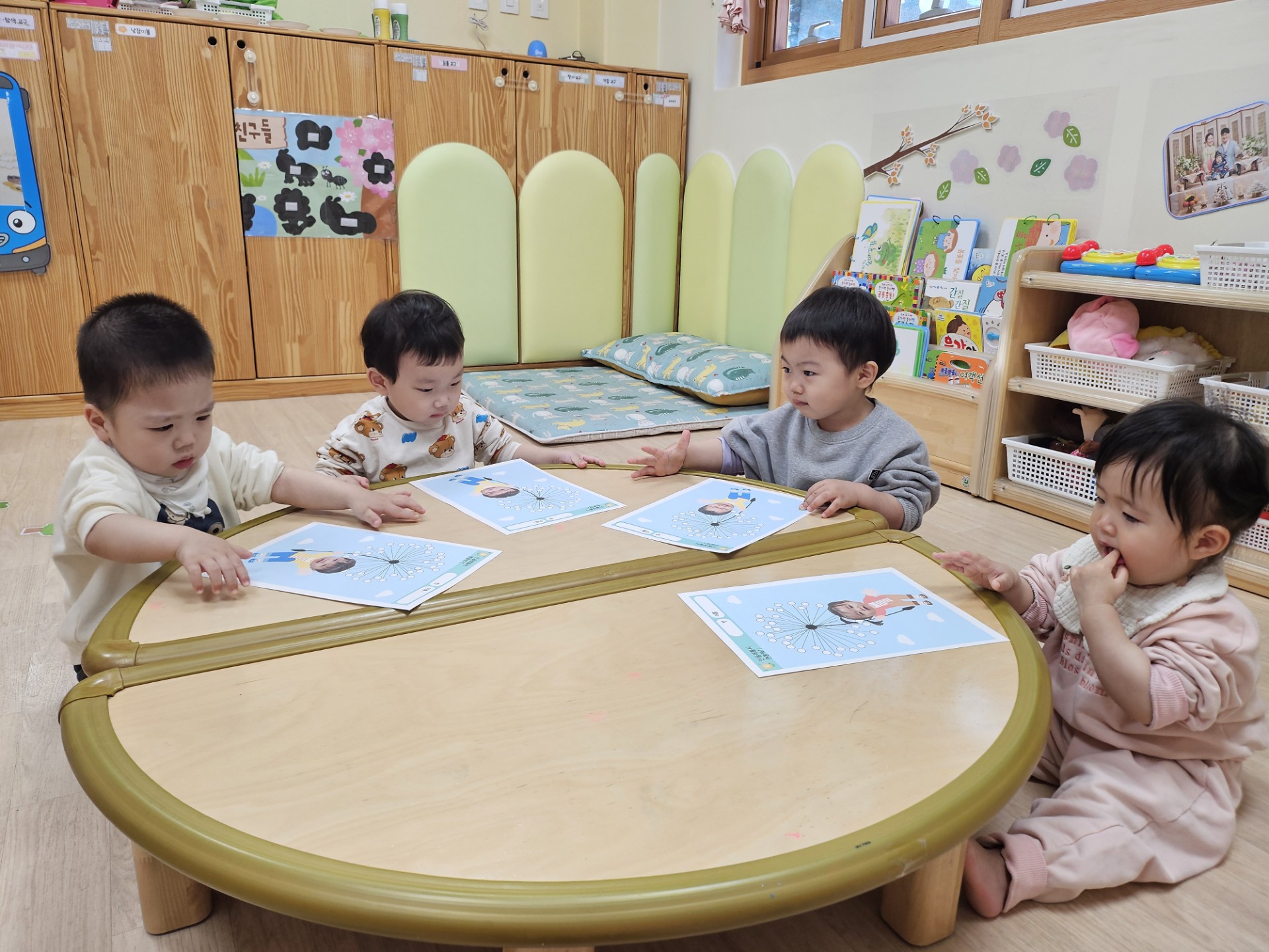 아이들 하나하나의 손길이 더해지며 민들레는 활짝 피어나고, 그 속에 담긴 표정들과 색감은 마치 진짜 봄이 도화지 위에 피어난 듯했답니다. 무엇보다 시원이가 “내가 만들었어!“라는 듯 자랑스레 도안을 들고 선생님께 보여주는 모습이 너무나도 뿌듯했어요.