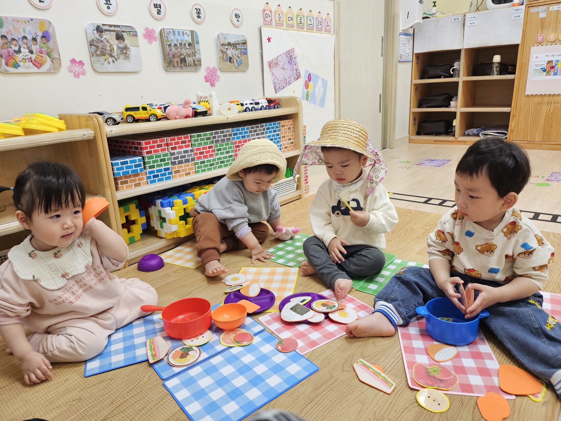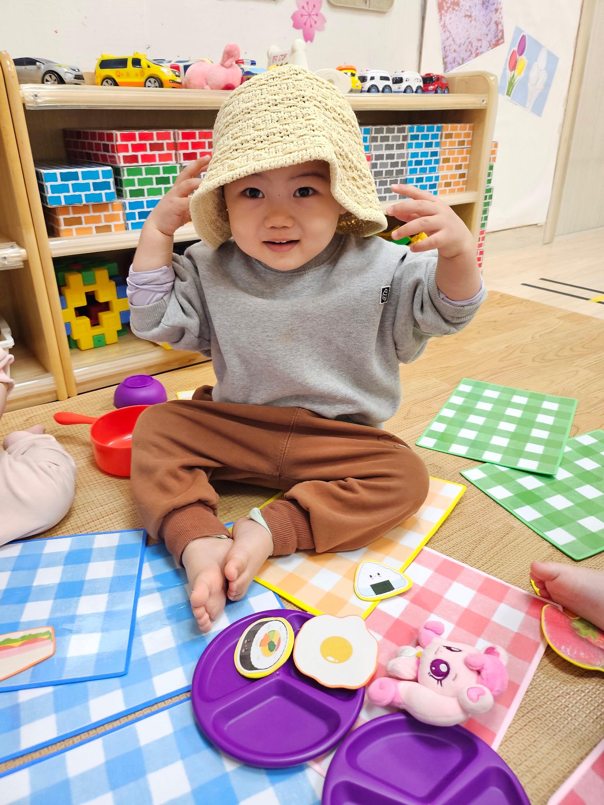 돗자리를 펼치고 앉은 아이들 얼굴에는 벌써부터 설렘이 가득했답니다. 햇빛을 가려줄 귀여운 모자를 푹 눌러쓰고, 서로의 모자를 구경하며 깔깔 웃는 모습이 너무 사랑스러웠어요.